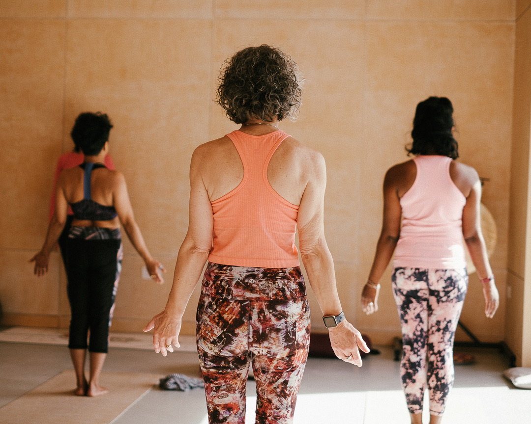 Each student in the group flows through the poses at their own pace, to the rhythm of their own breath. Teacher presence is maintained throughout, to provide a prompt or reminder of poses, and to guide and adjust as required.